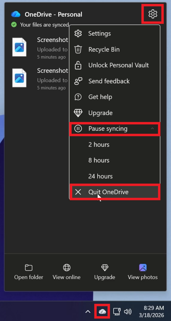 Make sure to click on the OneDrive Icon from the System Tray, then click on Settings from top right, then Pause syncing and finally Quit OneDrive.