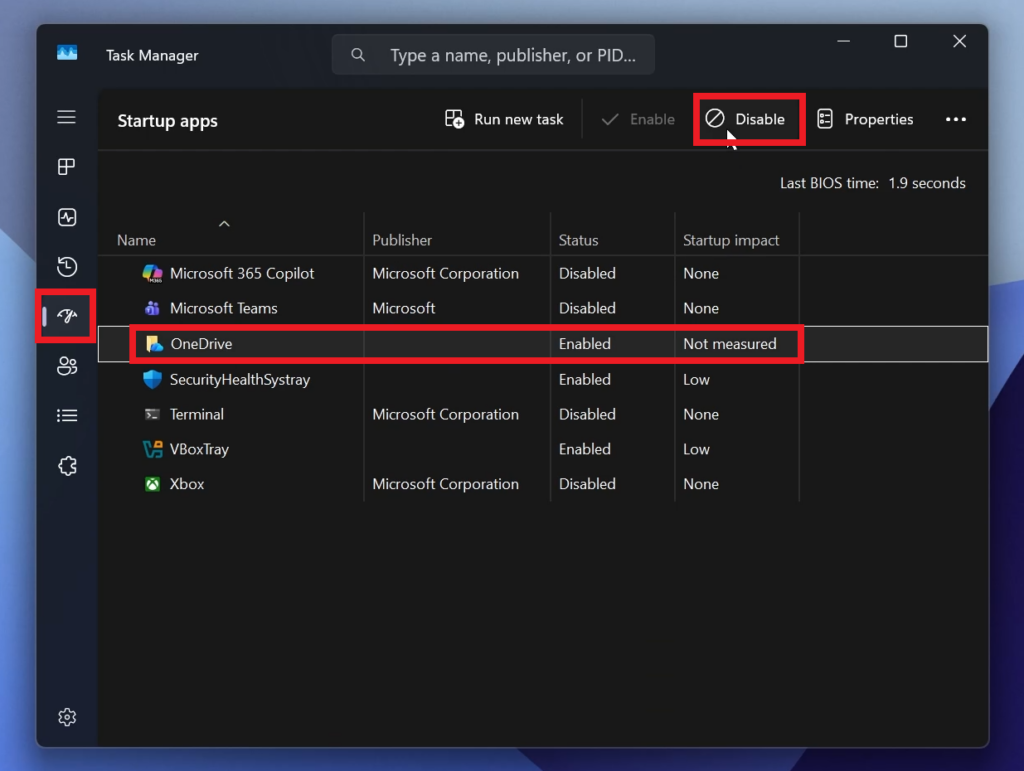 After that, right-click on the Taskbar, open Task Manager, go to Startup apps, select OneDrive and then click on Disable.