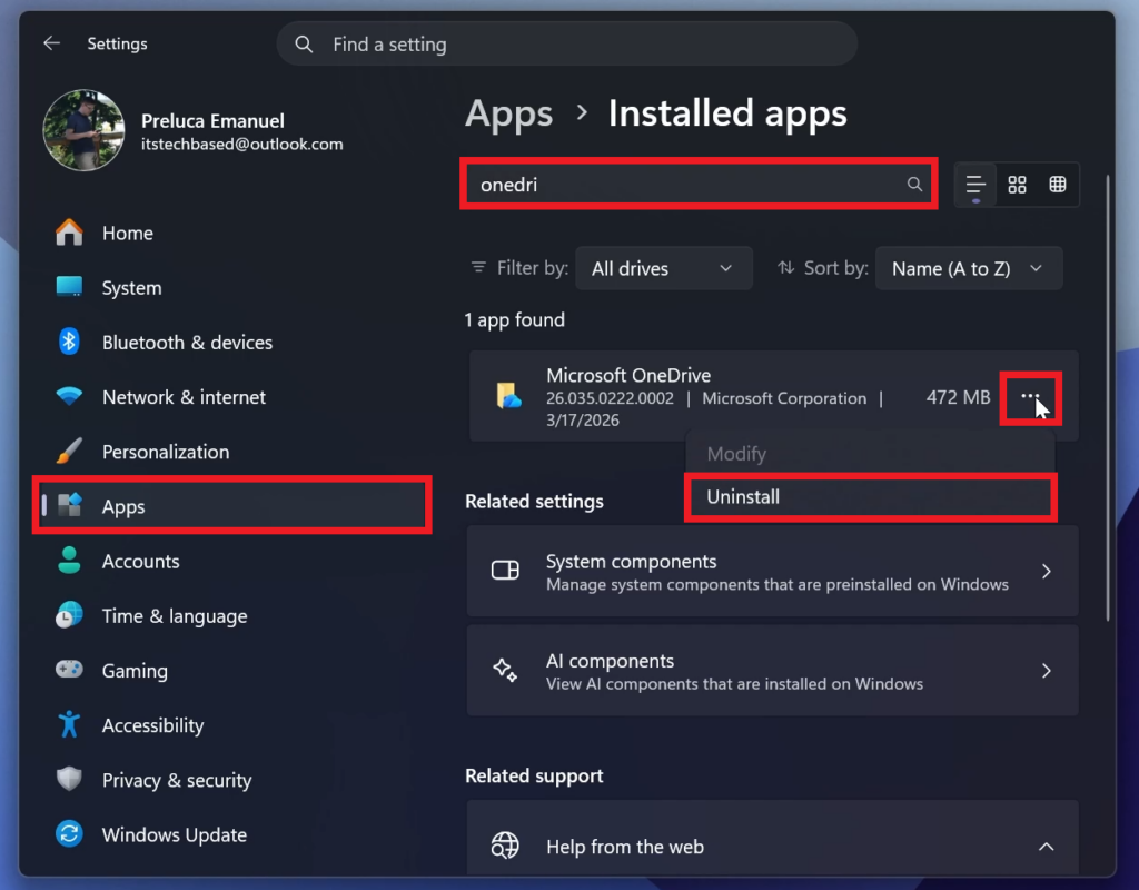 To uninstall OneDrive, make sure you open the Settings App (Windows + i), then go to Apps, search for OneDrive, click on the 3 dots and finally on Uninstall.