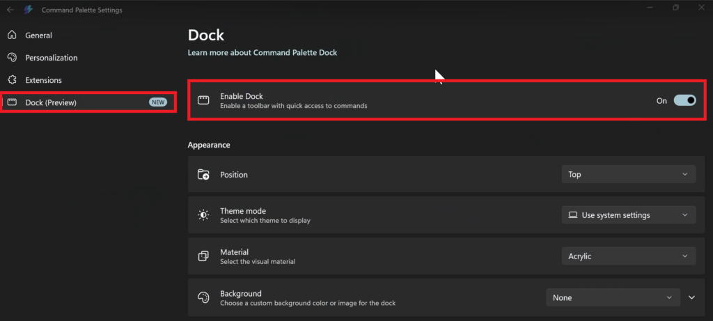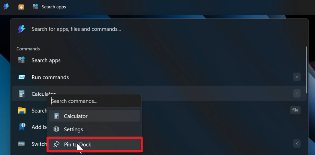 Additionally, you can pin certain apps and commands to the dock, by right-clicking on them and clicking on Pin to Dock.
