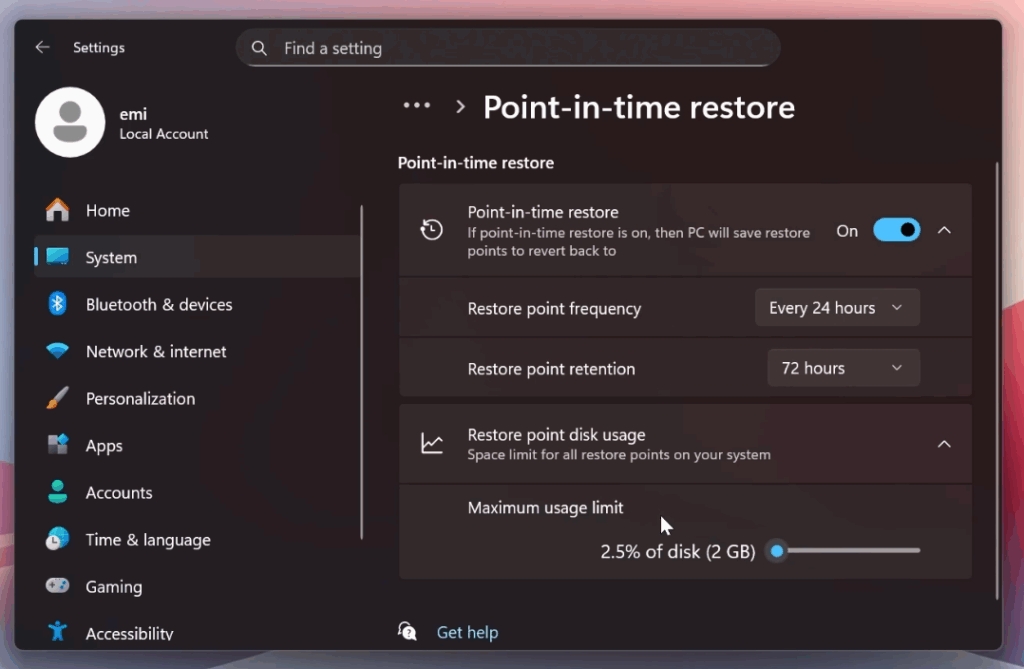 A Hidden Feature in this Build is also the rebranding of the Restore Points, now with the name Point-in-time restore and also with an UI. You can customize different settings and change the disk usage for this feature.