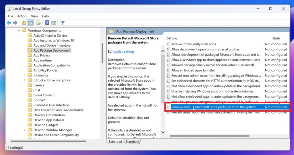 Computer Configuration > Administrative Templates > Windows Components > App Package Deployment > Remove Default Microsoft Store packages from the system