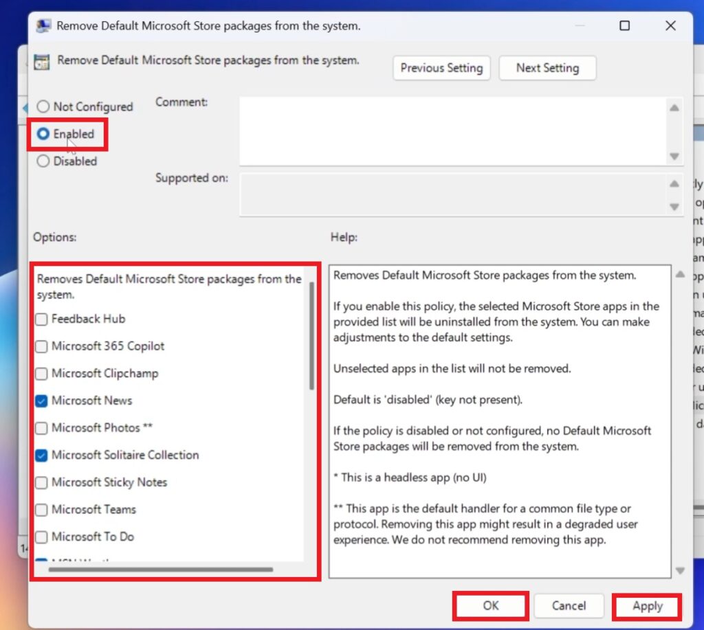 Double-click on the Policy, select Enabled and then select from the bottom, the packages that you want removed. After you’re finished, make sure to click on Apply and OK.