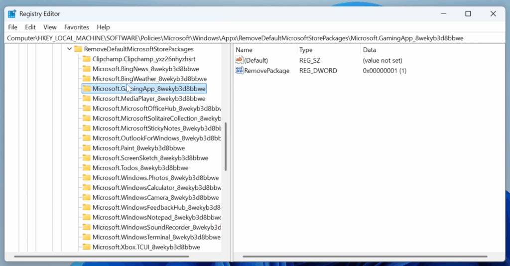 HKLM > SOFTWARE > Policies > Microsoft > Windows > Appx > RemoveDefaultMicrosoftStorePackages
