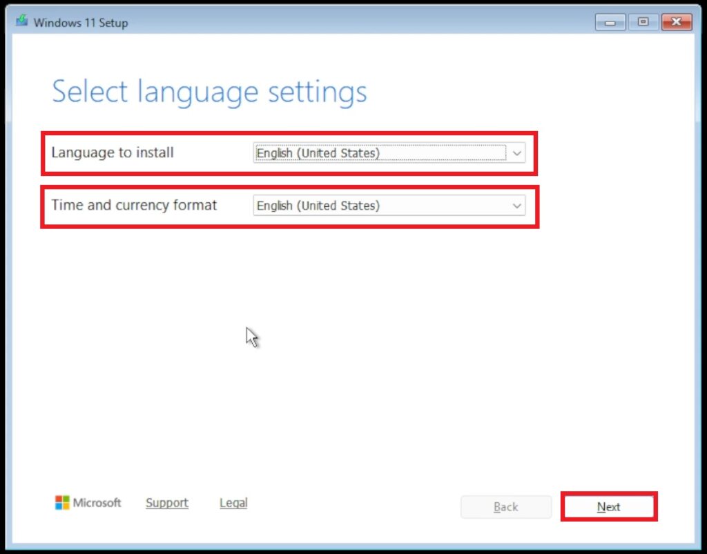 First of all, select your Language to install, Time and currency format and then click on Next.