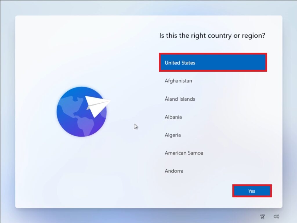 Inside the New OOBE Section, select your country or region and then click on Yes.