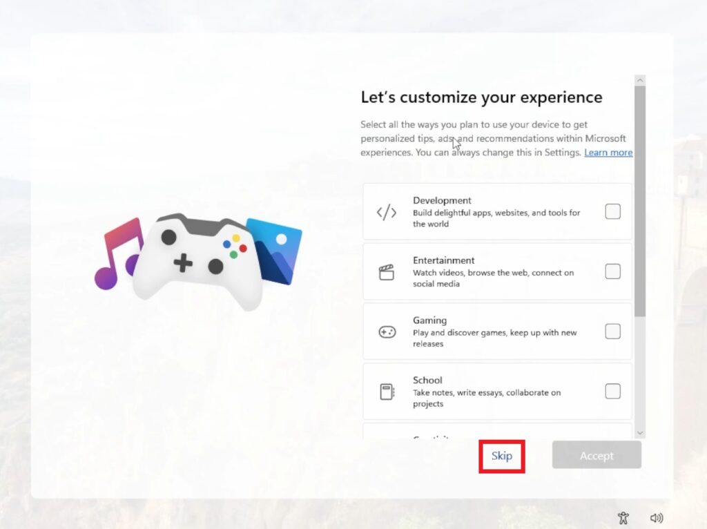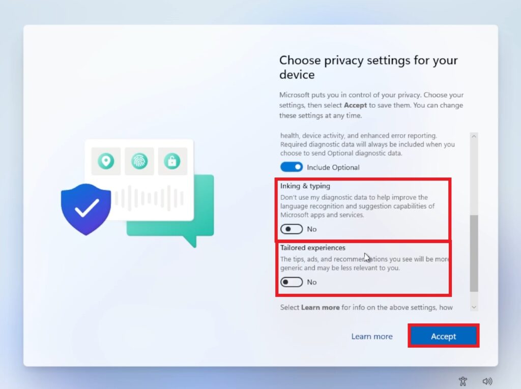 You can now customize your privacy settings (as an example I disabled Inking & typing and Tailored experiences) and then click on Accept.