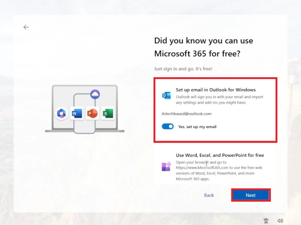 You can uncheck Set up email in Outlook for Windows and then click on Next.