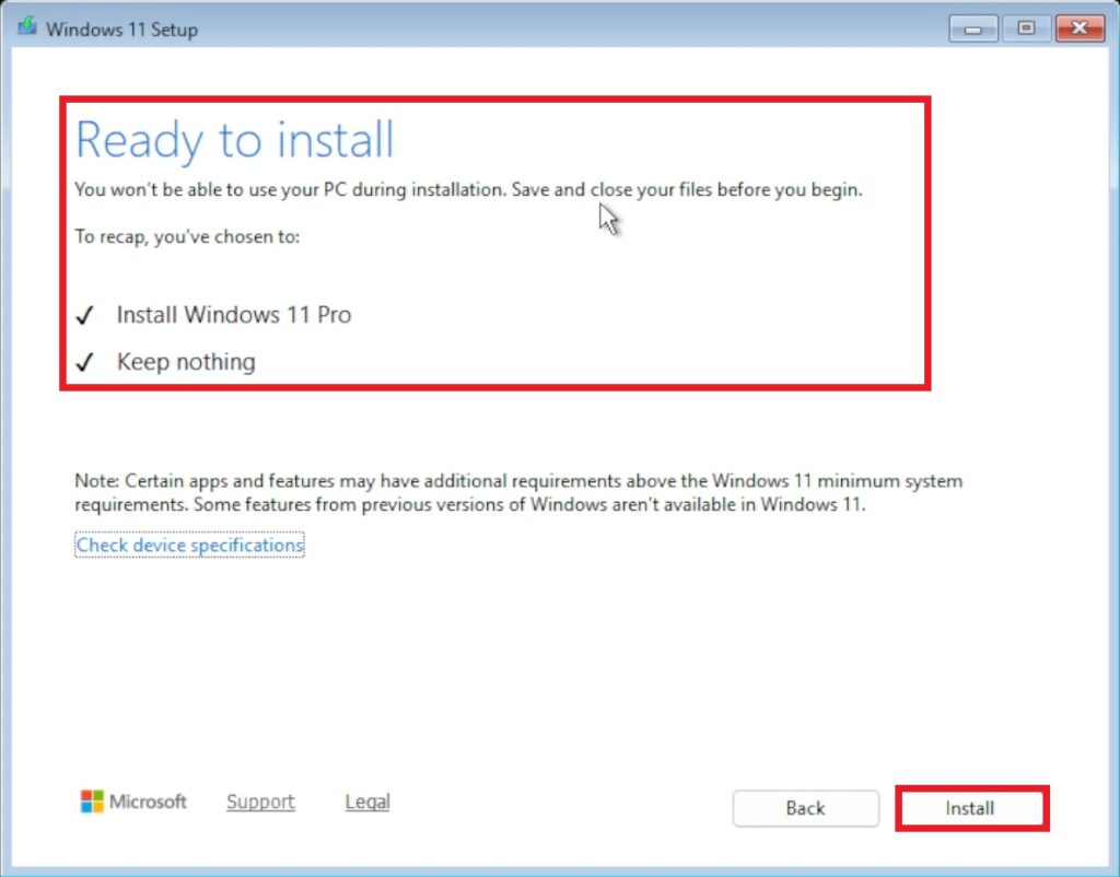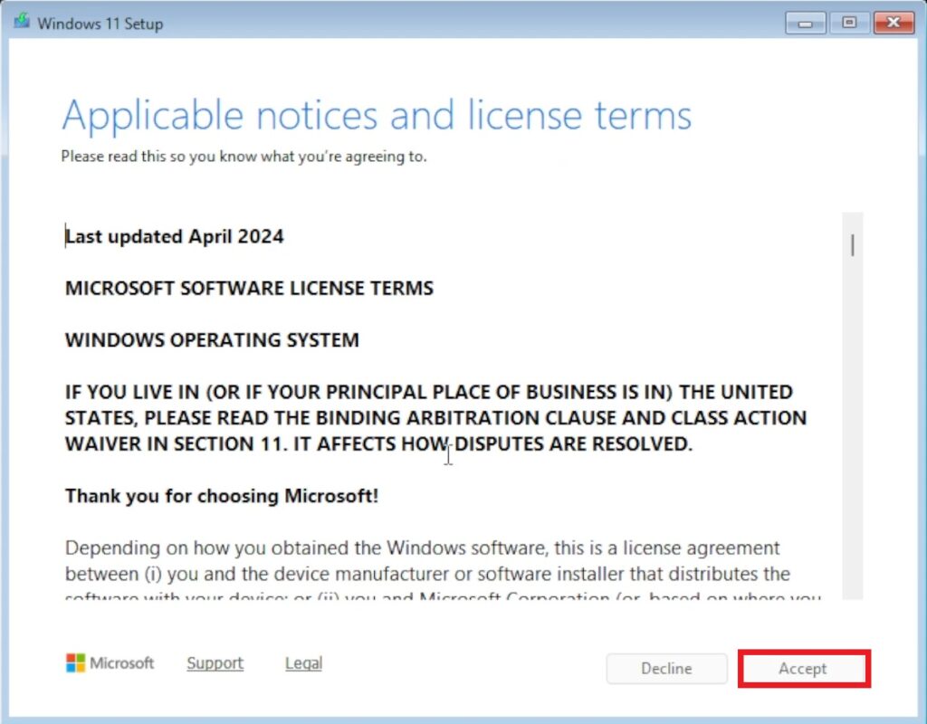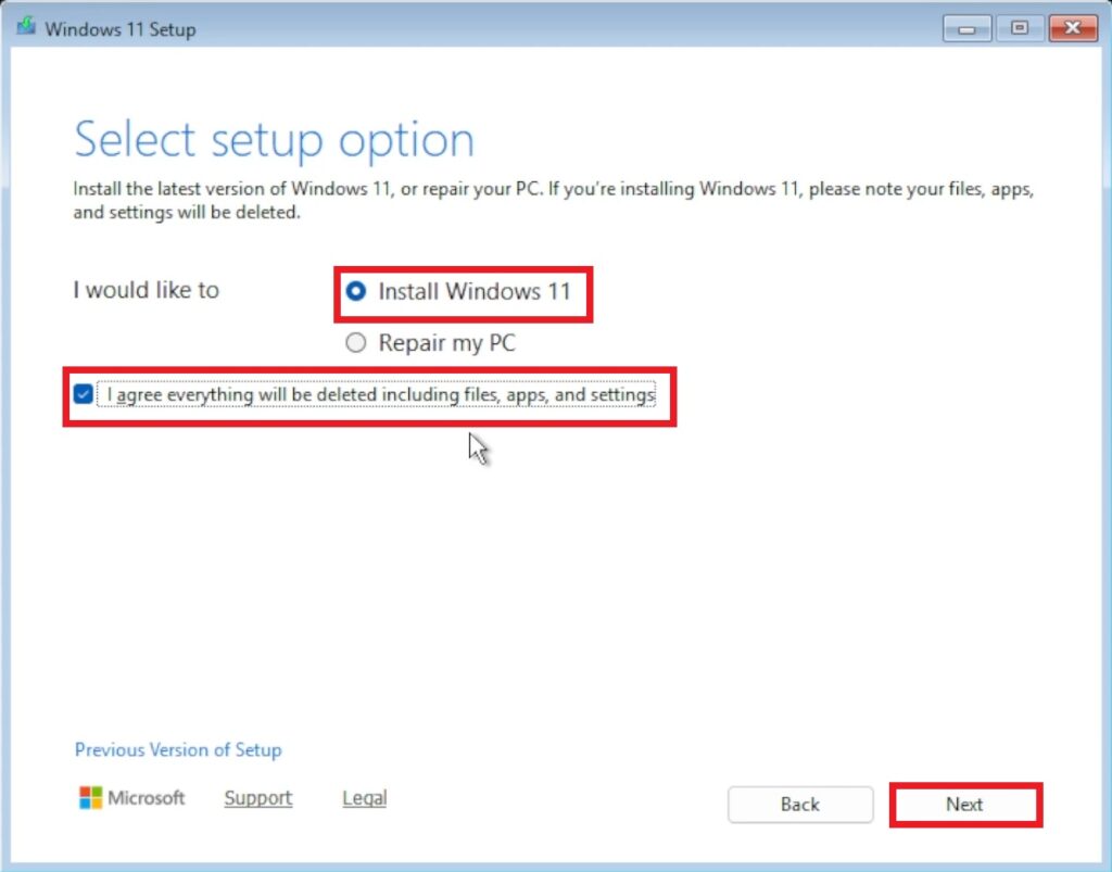Select Install Windows 11, select I agree everything will be deleted including files, apps, and settings and then click on Next.