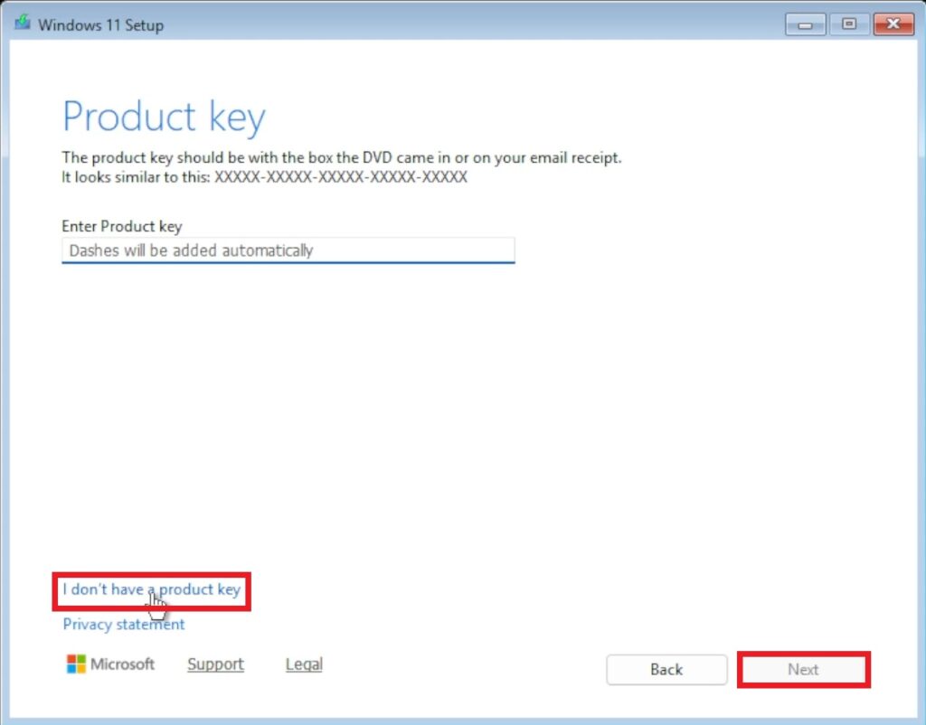 Click on I don’t have a product key (you can always add your license after) and then click on Next.