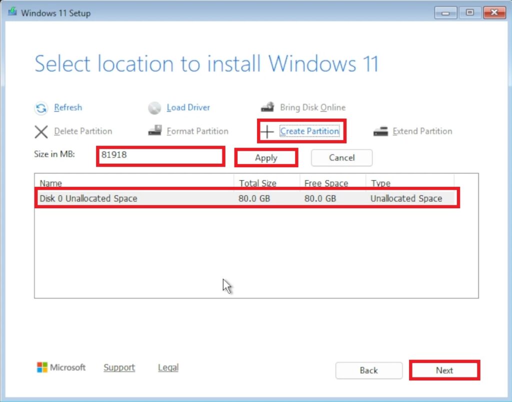 Next up, you will need to Create your partitions, by simply clicking on your Unallocated Space, then on Create Partition and then after inputting your Size in MB, click on Apply. After all these steps, click on Next.
