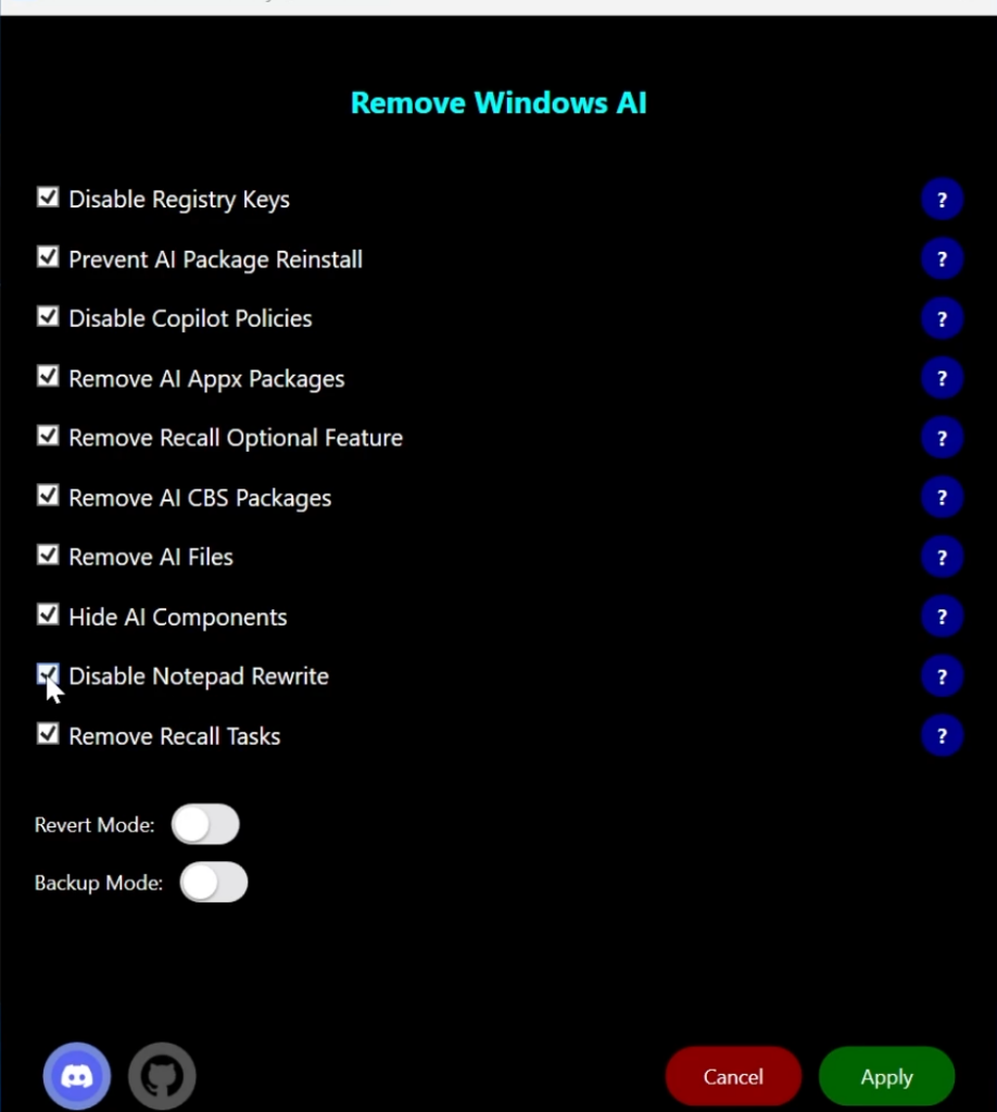 Once launched, the following UI will appear and here you can customize which AI Features to be removed and also you will have the option to Backup before running the script. Once you’re ready, just click on Apply.