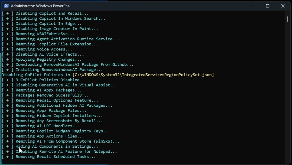 While the Script is running, you will be able to see in real-time everything that is being removed and after the process is finished, you will need to restart your computer for the changes to take effect.